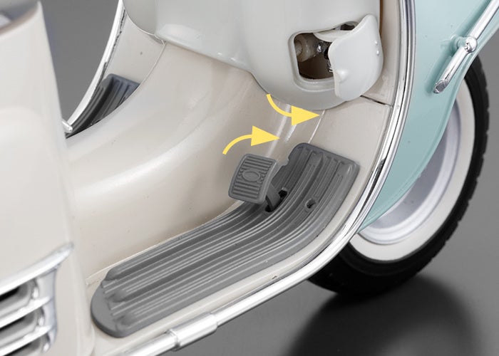 ボディは開閉可能で、上げると精巧に再現された199 ccエンジンやリアサスペンションに採用された空気ばねなどが見える。キックペダルは可動式。