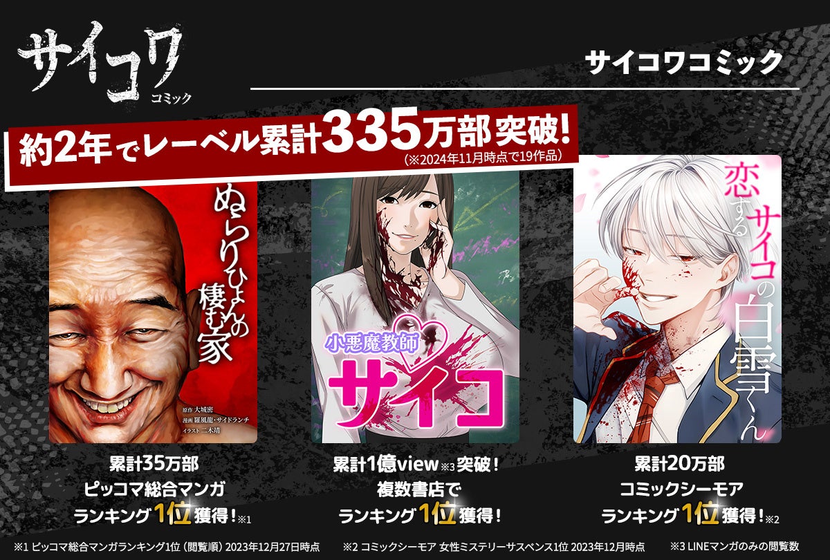 最強に怖い、「サイコワ」。peepでも人気の高いサイコパス要素の詰まった作品を始め、ホラー・ミステリー・サスペンスジャンルなどを取り揃える、最後まで目の離せない、スリル満点のマンガを制作・配信いたします。