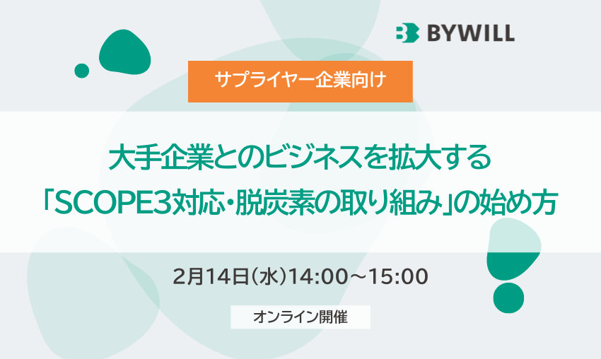 日本全国47都道府県のカーボンニュートラル実現を目指す株式会社バイウィルは、無料セミナー『大手企業とのビジネスを拡大する「SCOPE3対応・脱炭素の取り組み」の始め方』を2024年2月14日(水)にオンラインにて開催致します。
