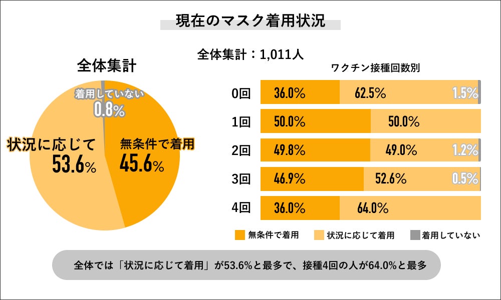 現在のマスク着用状況は「状況に応じて着脱」が53.6%で最多回答になり、次いで「無条件で着用」が45.6%、「着用していない」が0.8%でした。ワクチン接種回数別で見ると、「無条件で着用」が最も多かったのはワクチン「1回接種済み」の回答者で50.0%、次いで「2回接種済み」の回答者が49.8%、「3回接種済み」の回答者が46.9%で、「接種0回」と「4回接種済み」の回答者は共に36.0%で最も低い回答結果になりました。