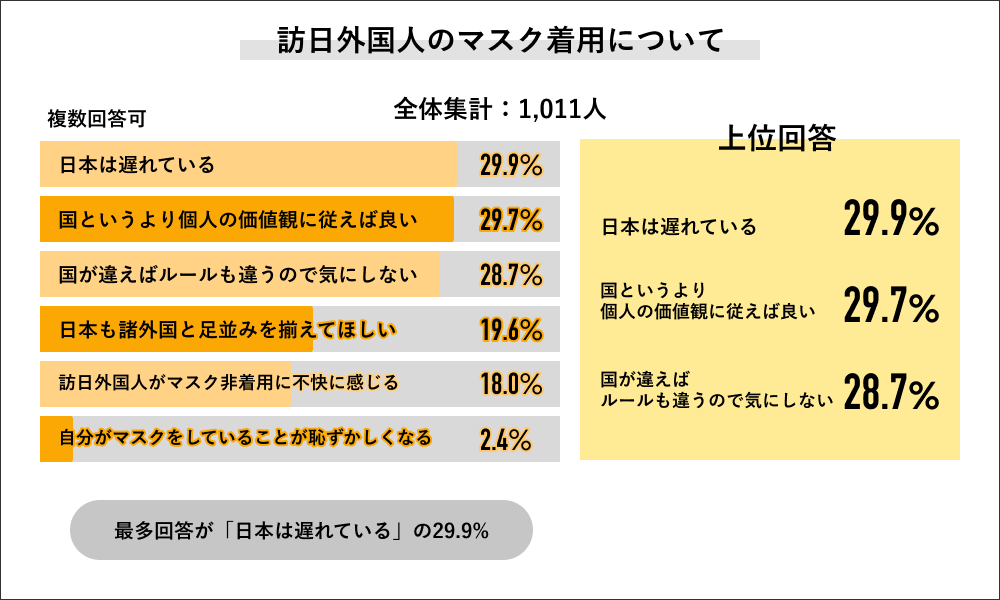 これを裏付けるのが、諸外国とのマスク着用意識に対する解答からも見られます。10月から開始した水際対策の緩和により、訪日外国人が増加傾向にある日本で、諸外国とのマスク着用意識にズレが生じていることが顕になりましたが、この事についての調査結果では「日本人は遅れている」と言った意見が多い中、「個人の価値観で良い」「国によって違うことだから気にしない」など、マスク着用は個人の価値観で良いと言った意見も多数を占める結果になりました。