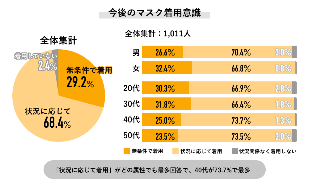 今後のマスク着用の意識を聞くと、「状況に応じて着脱」が68.4%で最多になり、次いで「無条件で着用」が29.2%、「着用しない」が2.4%の結果になりました。現状の着用状況と比べると、「無条件で着用」が減って「状況に応じて着脱」と「着用しない」がそれぞれ増える結果になりました。