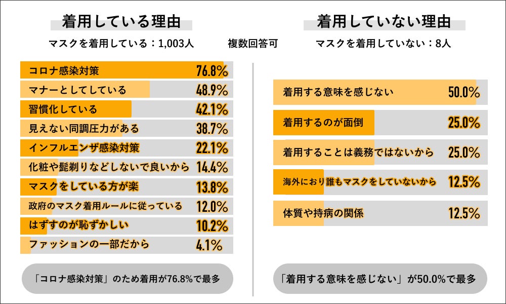 着用している理由を聞くと、「コロナ感染対策で着用」が76.8%で最多になり、次いで「マナーとして着用」が48.9%、「習慣化している」が42.1%で上位3つの回答結果になりました。これに対して着用していない理由では、「着用する意味を感じない」が50.0%で最多になり、次いで「着用が面倒」が25.0%、「義務ではないから」が25.0%で上位3つの回答結果になりました。