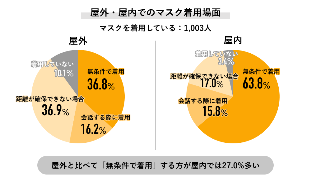 屋外でのマスク着用場面は「距離が確保できていない場合に着用」が36.9%で最多になり、次いで「無条件で着用」が36.8%、「会話する際に着用」が16.2%で、「着用していない」は10.1%でした。