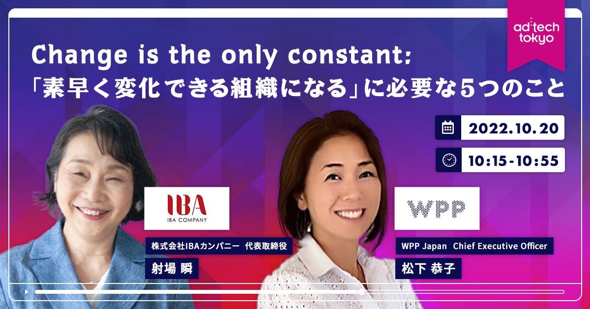 そんな時代にクリエイティビティを発揮するには、どんな組織が重要でしょうか?新しく独創性のあるアイディアや施策・ソリューションを生み出せる組織、それがビジネスイノベーションをリードすると考えます。このKeynoteでは、今年4月より世界最大のマーケティングコミュニケーションズグループWPPの日本代表に就任した松下恭子氏と国内外でビジネスコンサルタントとして活躍する射場瞬氏がパーパス、人材、データ&テクノロジー、リーダーシップの観点から、素早く変化できる組織作りについて意見を交わし、ad:tech tokyoに参加される皆さんの「ビジネスが成長する組織作り」の参考にして頂ければと思います。