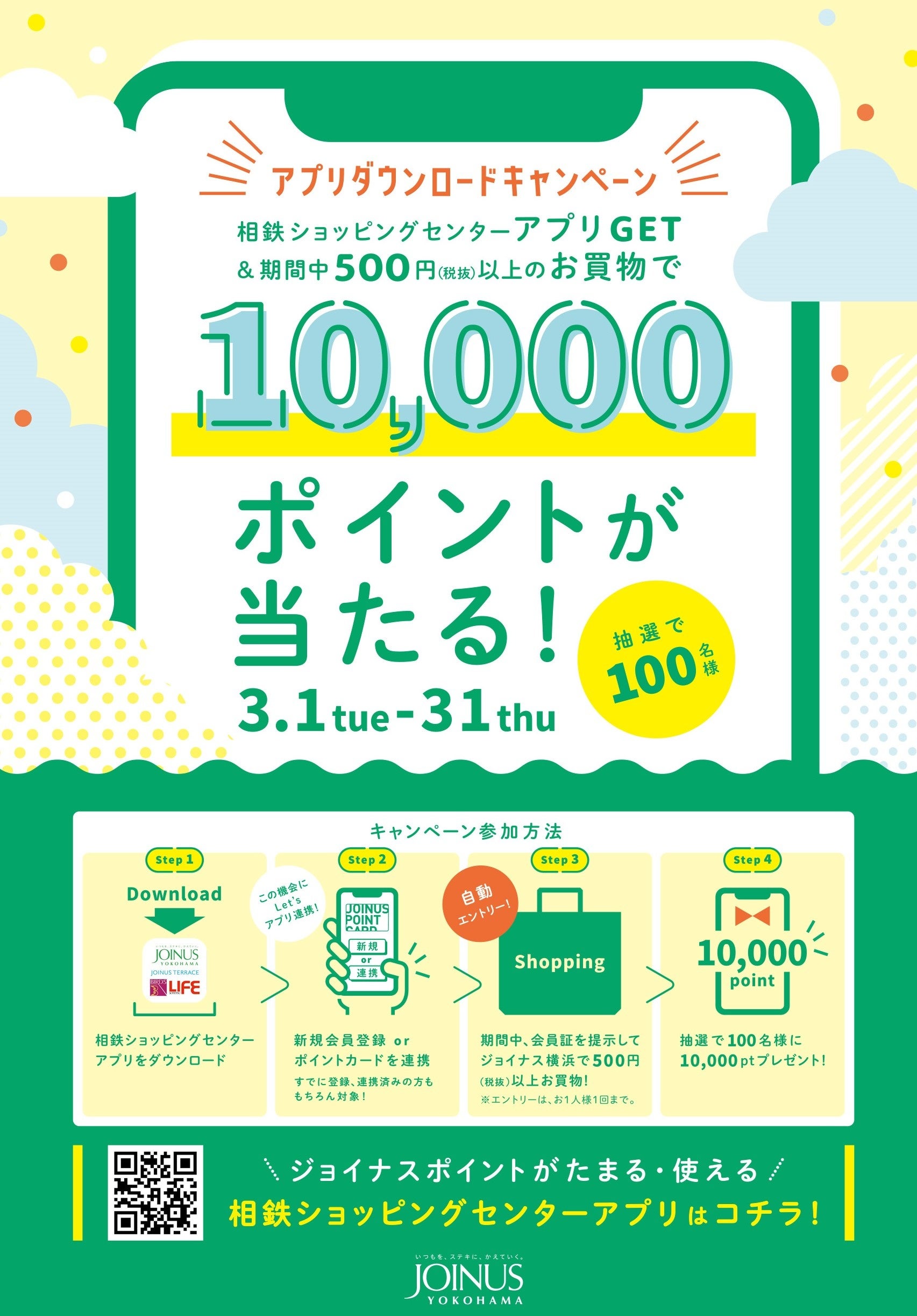 「相鉄ショッピングセンターアプリ」をダウンロード&新規会員登録またはジョイナスポイントカードを連携し、期間中、会員証を提示してジョイナスにて500円(税抜)以上のお買物をしていただいた方の中から抽選で