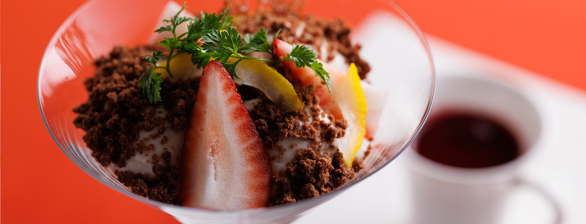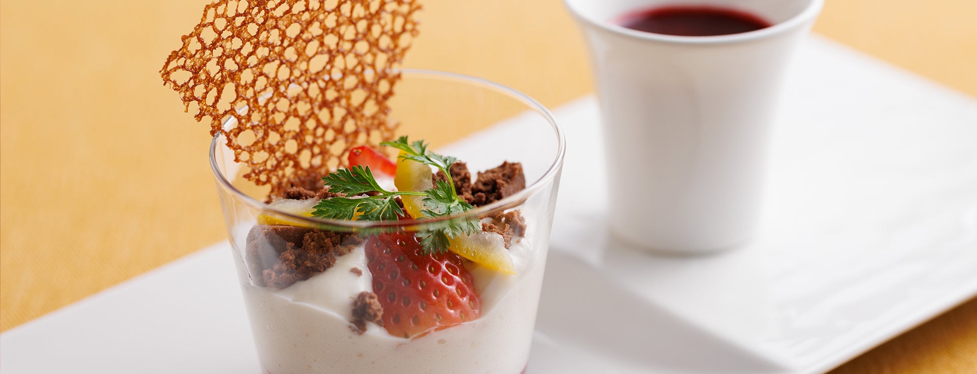 ○酒粕とマスカルポーネのコンポジションと柚子 温かな赤い果実と