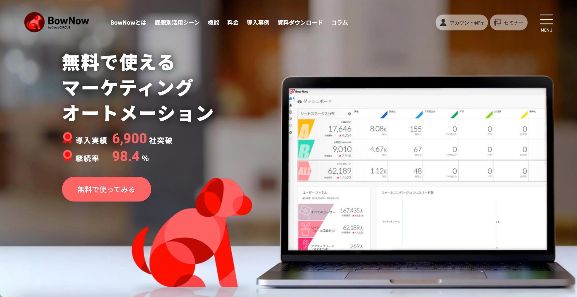 『BowNow』は、シンプルで低価格をコンセプトにした「無料で使えるマーケティングオートメーション」です。ホットリードの抽出に優れ、利用企業様は人員を増やすことや、Webサイト改修の必要なく、保有している見込み顧客リストを使ってミニマムスタートできる点が大きな特徴です。現在7,500社以上に導入が進み、(2021年9月末時点)国産MAツールとしてはシェア№1を誇ります。※DataSign社2021年3月期の統計結果に基づく