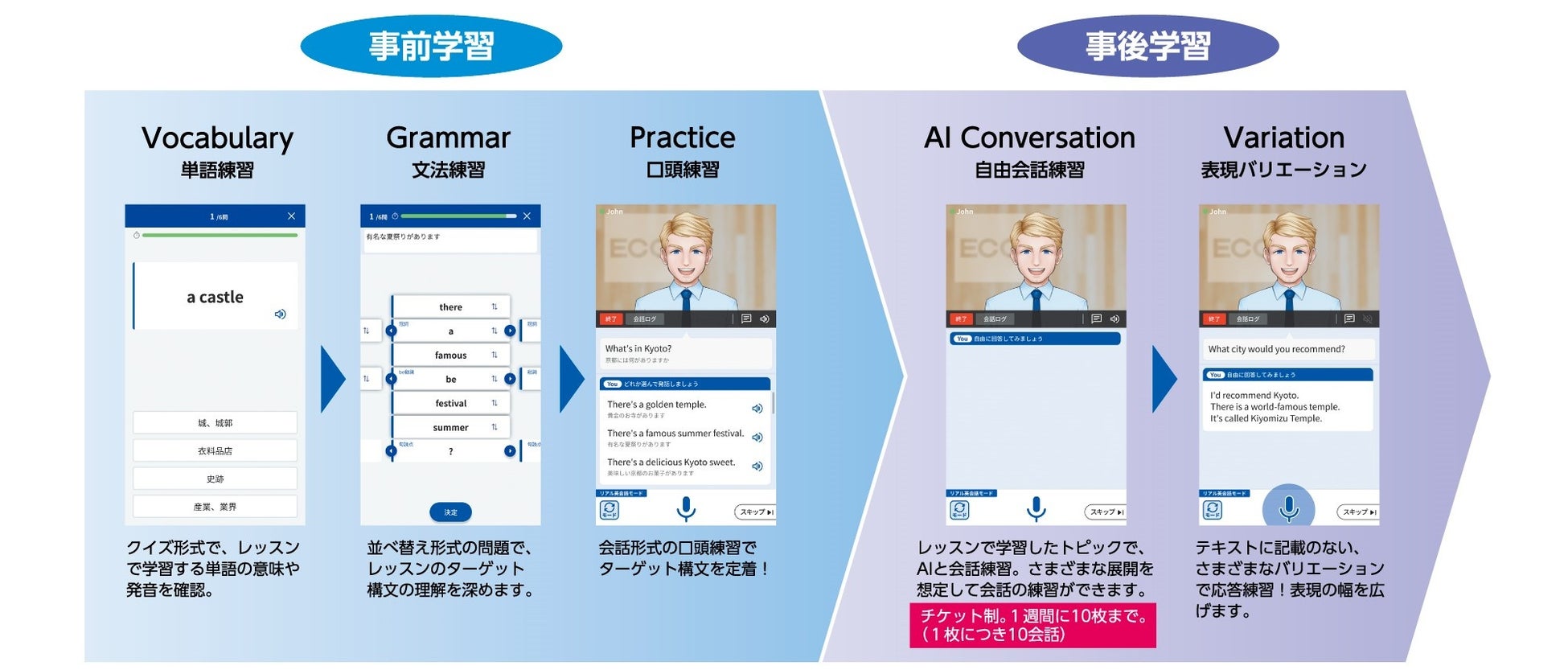 レッスン前・後の自宅学習では、「相手がおらず、英会話練習が難しい」「英語でなんと言っていいかわからず、発話練習が難しい」といったお声がありましたが、レッスンと組み合わせて事前・事後学習に本アプリを活用することで、会話練習の機会を増やし、より効果的な学習につなげます。