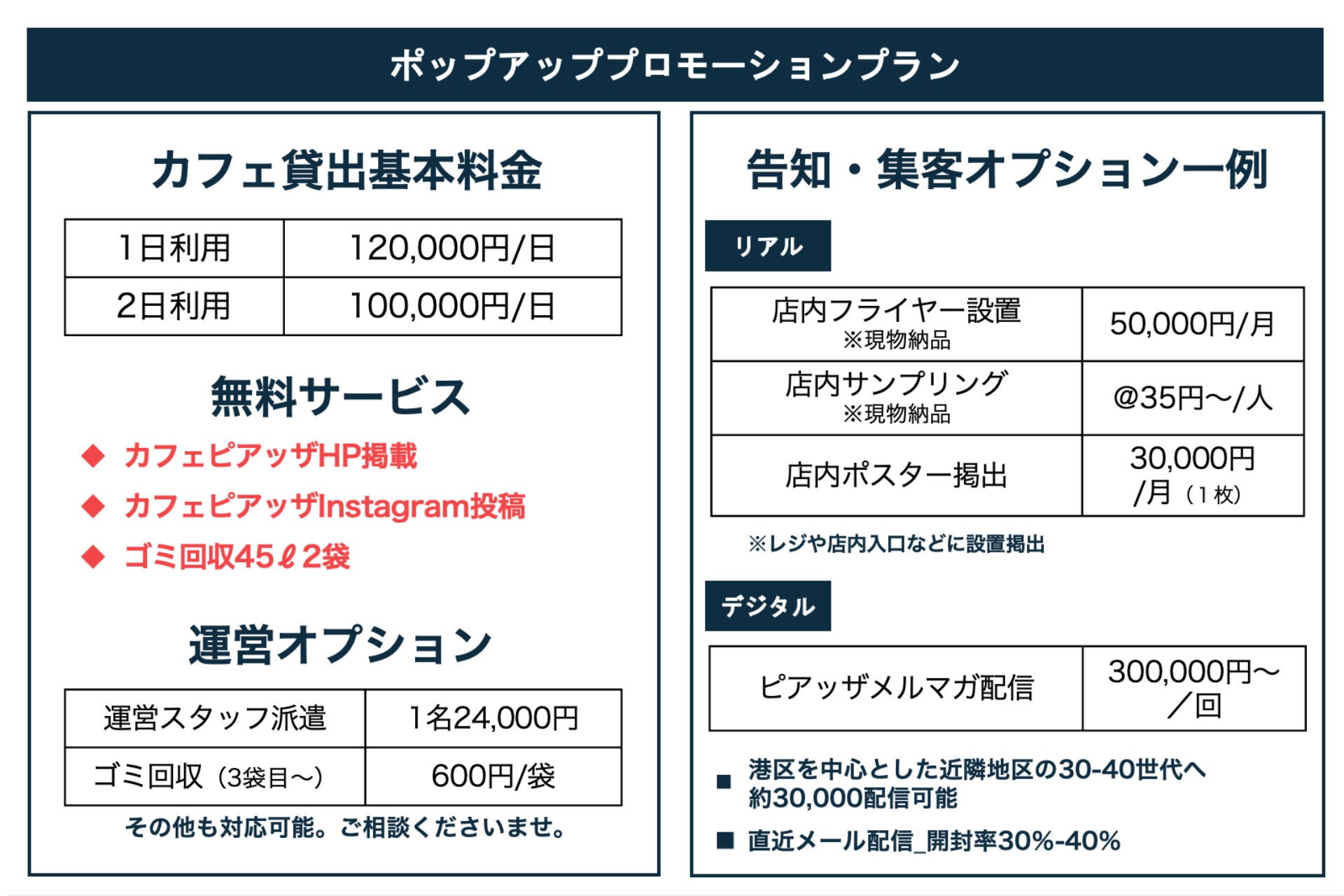 なお本プランは、ニーズや予算に合わせたアレンジが可能で、カフェの貸し出しだけでなく当社の地域コミュニティアプリを活用し、地域住民との事前・事後コミュニケーション・メルマガ・広告出稿など、ローカルプロモーションによる集客支援も可能です。