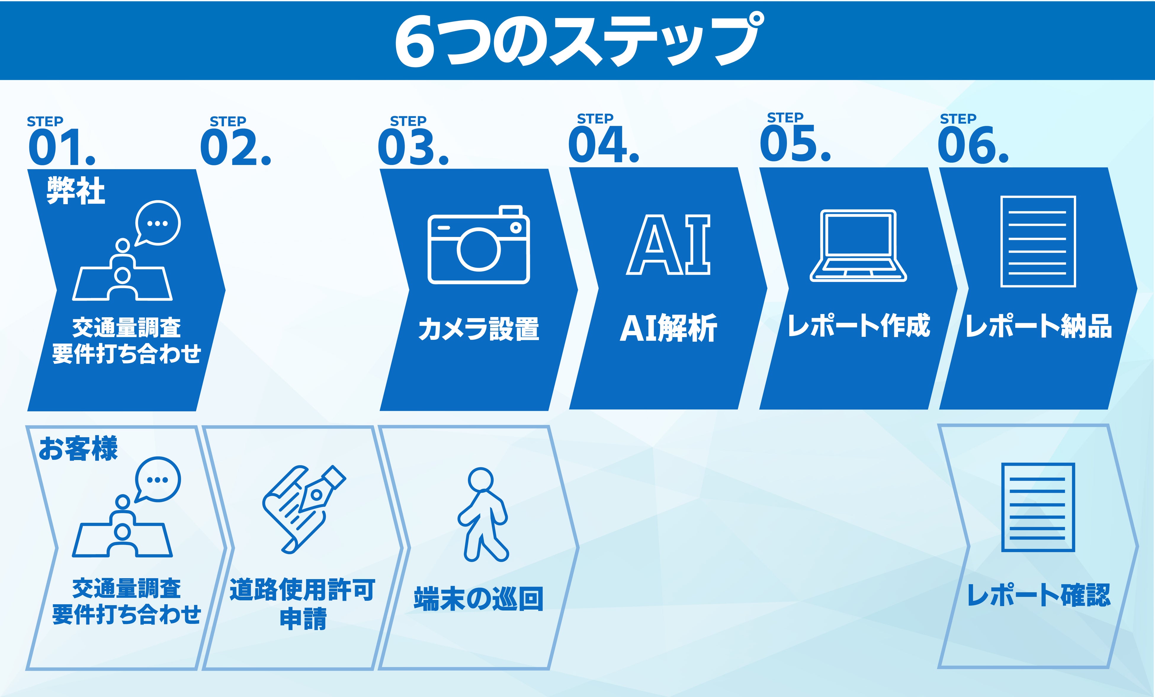 お客様が必要とする作業は以下の4つだけです。「打ち合わせ」、「管轄警察署への道路使用許可の申請」、「管轄警察署の指導に従った端末の巡回」、「納品レポートの確認」。以上を行うことだけで、ユーザーが必要としている要件にあわせて交通量調査のデータを取得できます。
