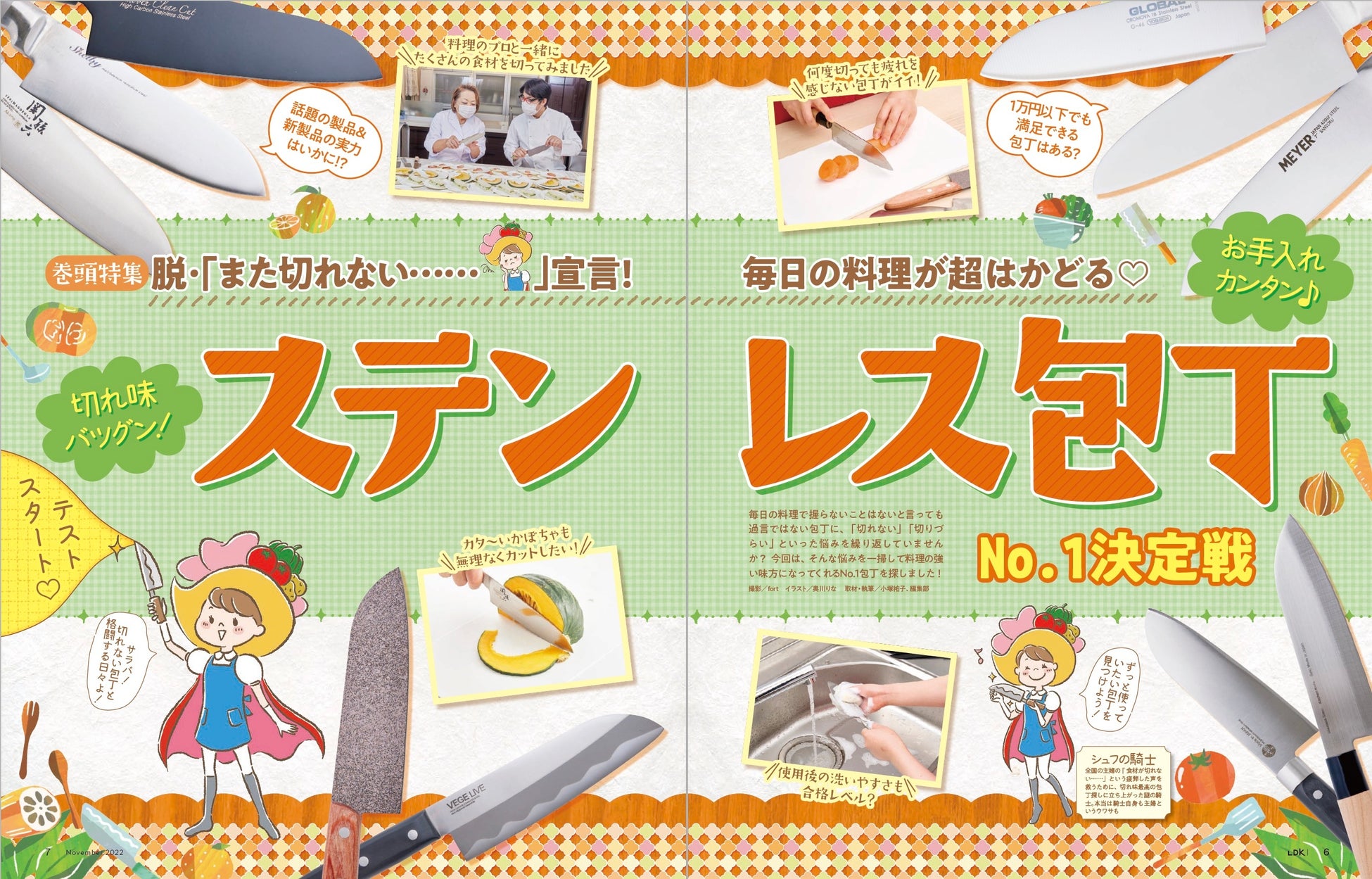 11月号では、「毎日の料理が超はかどる♡ステンレス包丁No.1決定戦」を大特集! 新製品や巷で話題の製品を中心に、1万円以下で買えるステンレス包丁を12製品テストして最高の切れ味が続く1本を探しました。そのほかにも、頑張っているのに片付かない「惜しい収納」を解消するモノ&テクを総力特集。さらに、「ダイソー&3COINS新商品パトロール」や、1000円以下で買える「プチプラシャンプー14製品ベストランキング」、毎日の健康管理やダイエットをサポートする「体組成計選び」など、暮らしに役立つ情報満載でお届けしています。本リリースでは、編集部が“本当におすすめできる”製品の⼀部をご紹介します。