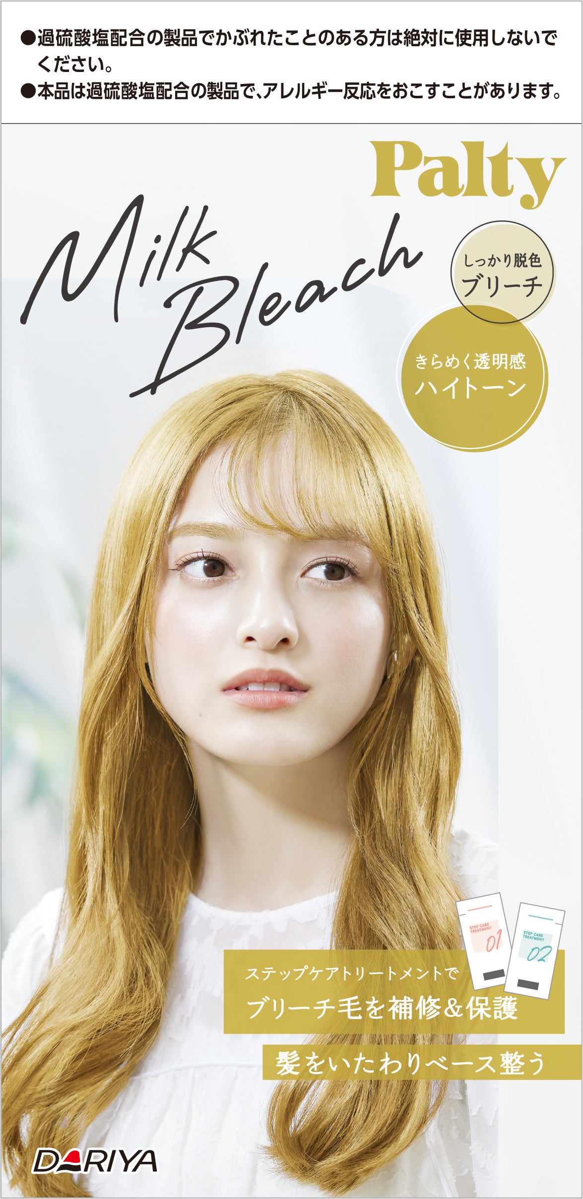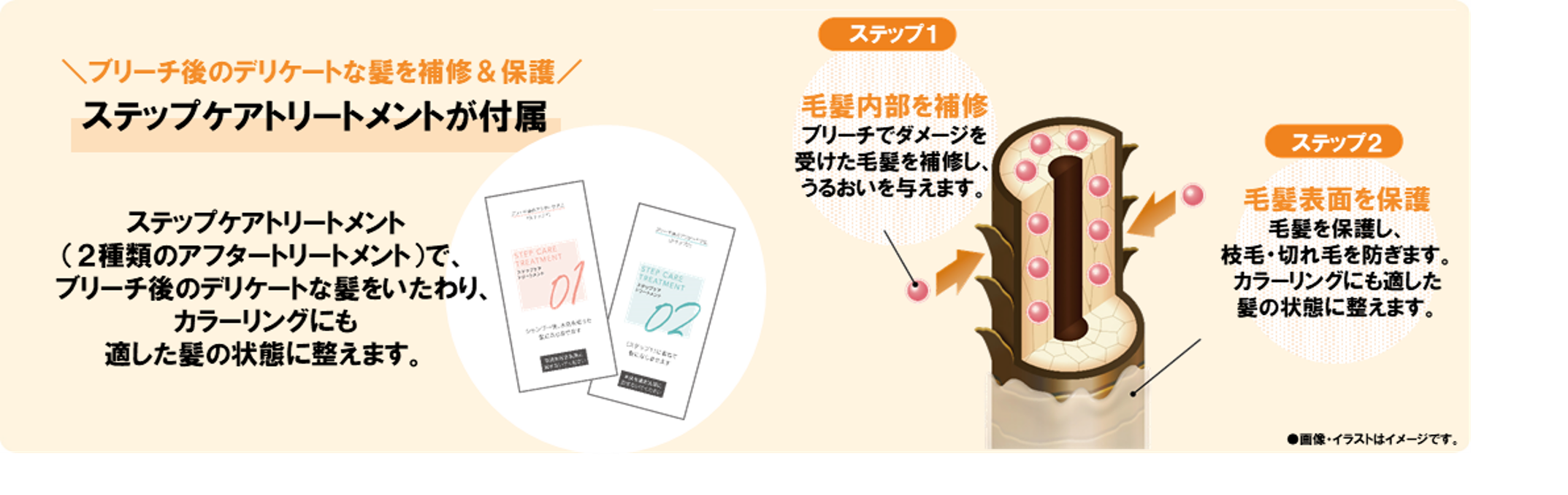 トリートメント成分配合のブリーチで髪を明るく脱色、付属のステップケアトリートメントで、ブリーチ毛を補修&保護します。明るく脱色した髪は、次のヘアカラーがよりきれいに発色します。