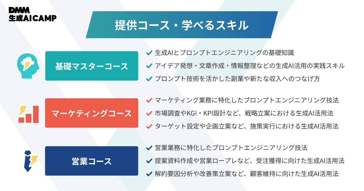 「DMM 生成AI CAMP」では、マーケティングや営業など、様々な職種に特化したコースを提供します。各コースでは、それぞれの業務に即した生成AIの活用方法を学ぶことができ、すぐに業務に生かせる実践的なスキルの習得が可能です。また、「基礎マスターコース」では生成AIの基本的な仕組みや活用技術を学ぶことで、どの職種の方でも生成AIを業務に活用するための基礎スキルを身につけることができます。今後はエンジニアやWebデザイナー、データサイエンティストなど、多様な職種に対応したコースを順次拡充していく予定です。