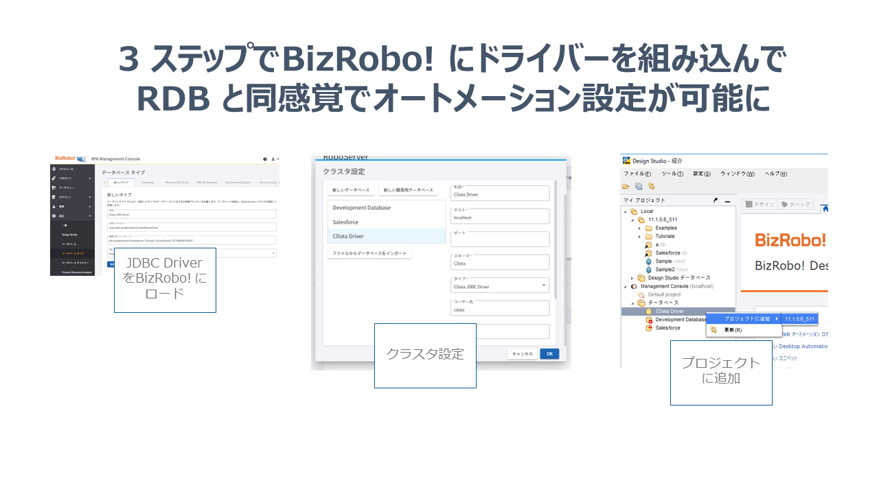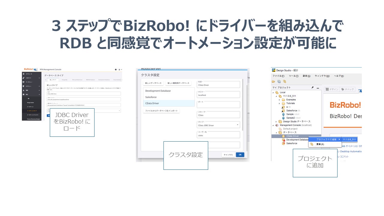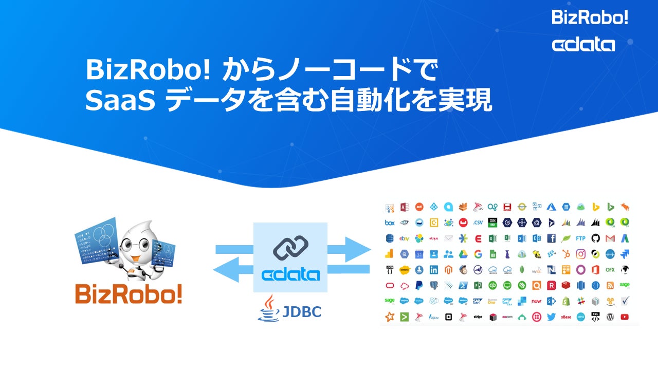 一方でCData JDBC Drivers は、BizRobo! に組み込んで使用するだけで、BizRobo! からローカルのRDB データへのアクセスと同様に、SQL で各種SaaS に連携することが可能になります。API プログラミングが不要になることにより、BizRobo! を使用した幅広いオンプレミス- SaaS の連携シナリオや、SaaS - SaaS 間の連携を実現することが可能になります。