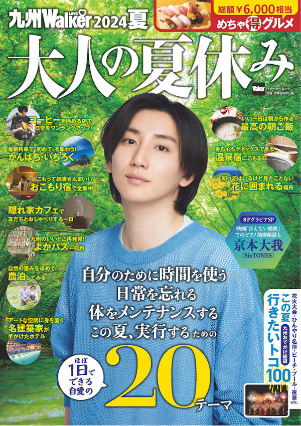 九州・福岡をとことん楽しむためのレジャーガイド本「九州LOVEウォーカー」。最新号では、「大人の夏休み」と題し、この夏に忙しい日常を離れて、自分をリセットしたりワンランクアップするための過ごし方を40ページを超えるボリュームで大特集します。「自分のために時間を使う」「日常を忘れる」「体をメンテナンスする」ための20テーマをセレクトし、九州エリアの57スポットを集めています。