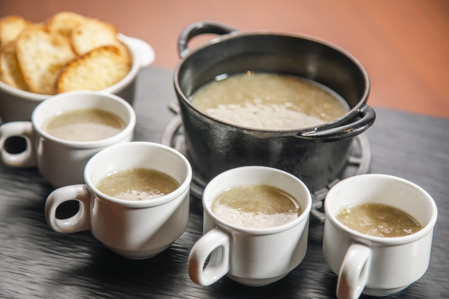 玉ねぎの甘みとコクを堪能できるオニオンスープ。チーズバゲットを浸して食べていただくのもおすすめです。
