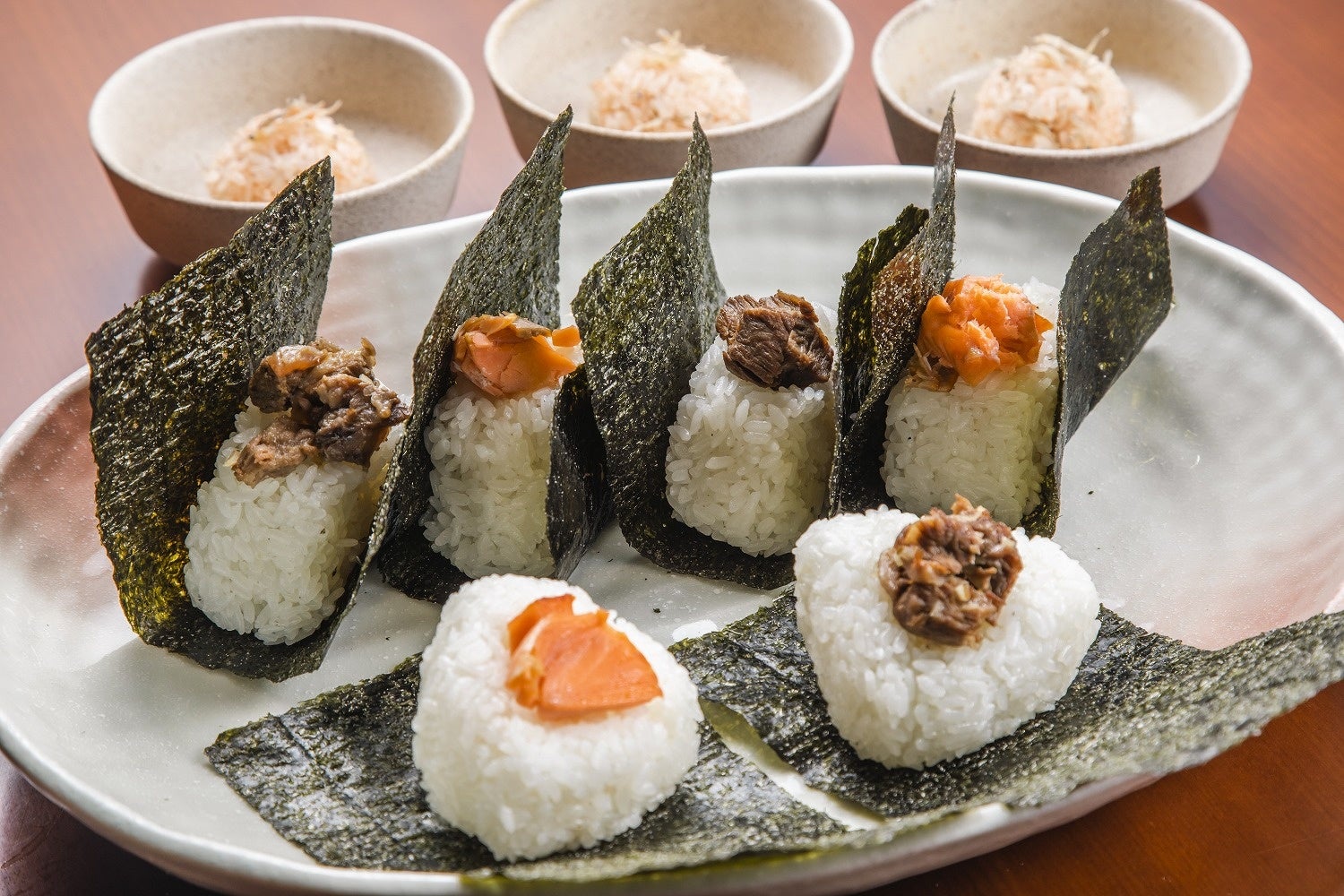 宮崎牛の時雨煮、奥日向サーモンの西京焼きのおにぎり。宮崎ちりめんと明太子の混ぜご飯おにぎりには、宮崎県の日本茶専門店「新緑園」のお茶で作った茶出汁をかけてどうぞ。