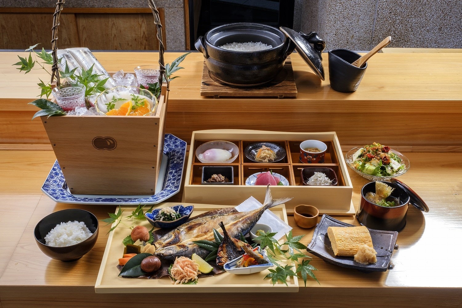 常連のみが食べられる朝食コースで話題の名店「くろぎ」店主 黒木純が監修した、すべてにおいて素材にこだわり、食べ方にもこだわった特別な朝ごはんが完成しました。サラダのドレッシングにもなる冷や汁をはじめ、焼き魚や宮崎牛時雨煮、千切り大根とみやざき地頭鶏の煮物など、土鍋ごはんに合うおかずの数々。特別に「実家 くろぎ」のカウンター席でお楽しみいただけます。