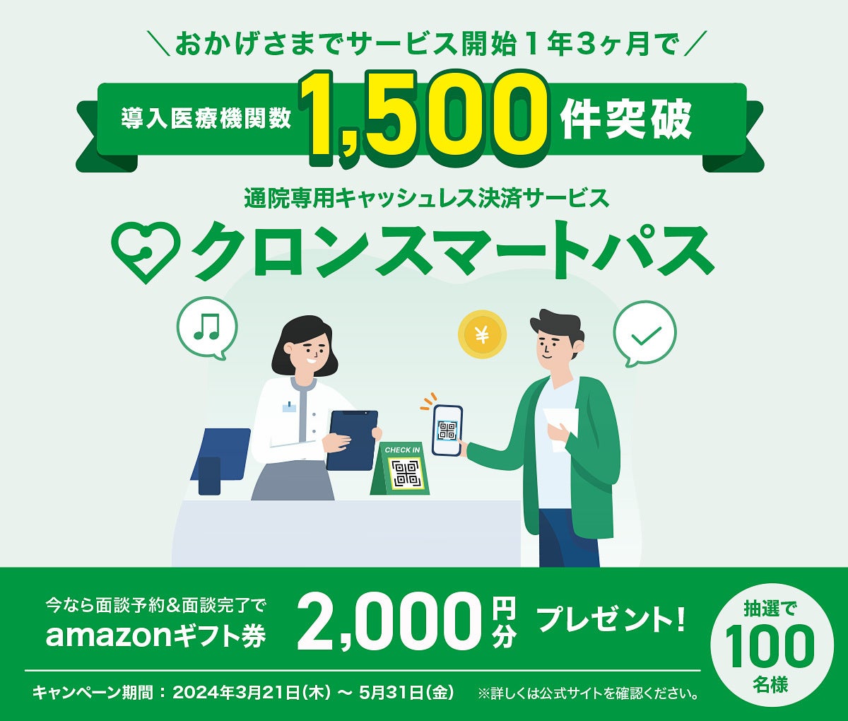 通院専用キャッシュレス決済サービス「クロンスマートパス」導入医療機関数が1,500件を突破