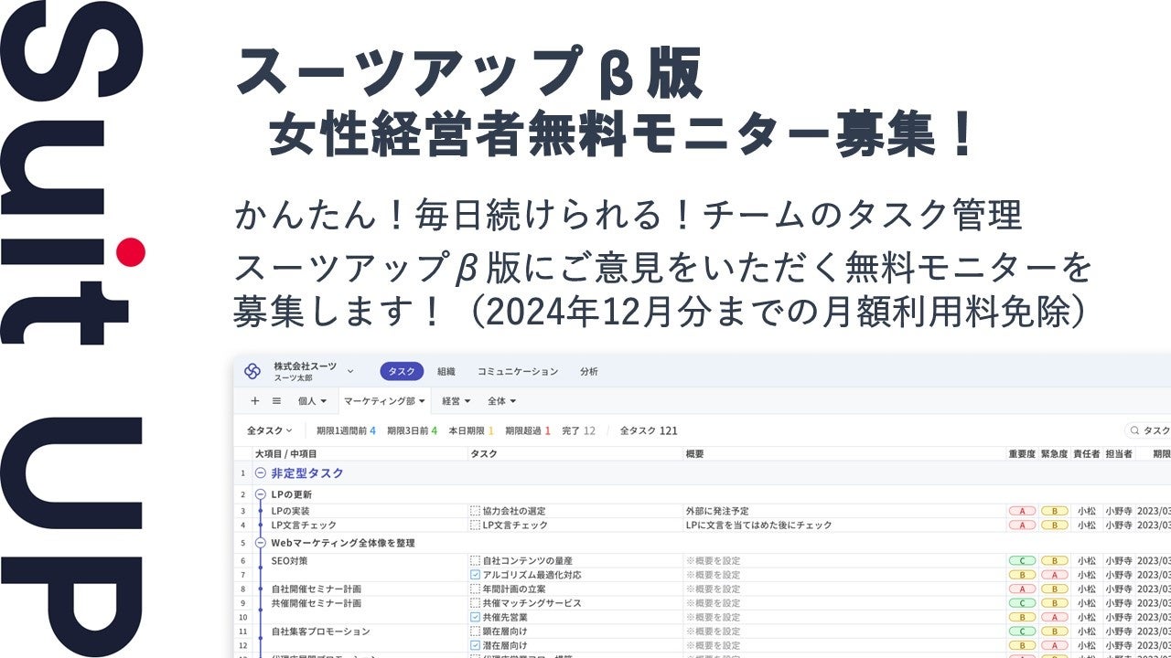 株式会社スーツ(所在地:東京都千代田区、代表取締役社長CEO:小松 裕介)は、チームでかんたん、毎日続けられるプロジェクト・タスク管理ツールの経営支援クラウド「Suit UP」(スーツアップ)の女性経営者の無料モニターを募集いたします。