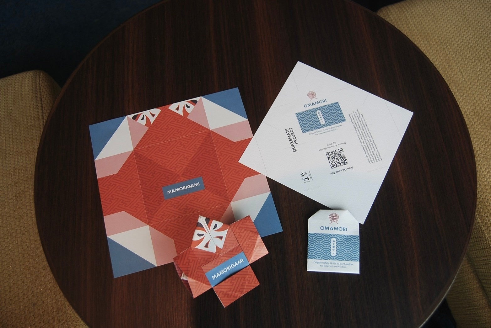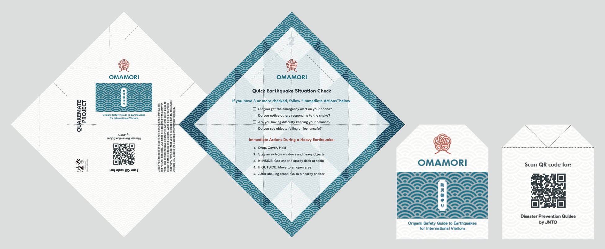 「BOSAI ORIGAMI」は日本における地震対策や災害予防に関する記載があり、重要な防災情報を学ぶことができます。折り終えると「OMAMORI(御守り)」と「MAMORIGAMI(やっこさん)」のデザインとなり、持ち歩くことができます。お守りは日本の神社で見られる伝統的なお守りにインスパイアされ、やっこさんは地震から守ってくれるとされる日本の神話の神様、武甕槌命(タケミカヅチ)のデザインとなります。