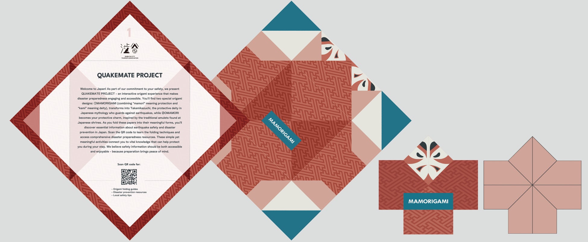 「QUAKEMATE PROJECT」とはQUAKE=「揺れ/地震」、MATE=「仲間/相棒」2つの言葉を組み合わせてできた造語となります。日本滞在中、災害が起きた際に落ち着いて行動ができるよう、インバウンドの防災リテラシー向上をクリエイティブの力でアプローチしていくプロジェクトです。本プロジェクトの一環として、楽しく、わかりやすく災害対策を学べる折り紙「BOSAI ORIGAMI」を制作しました。