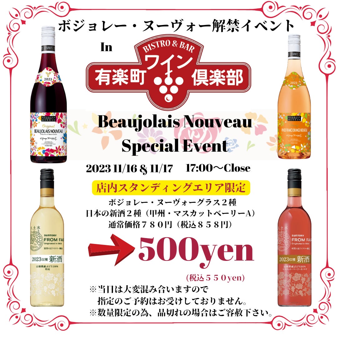 ワインにピッタリな小皿料理で至福の時間を演出する「有楽町ワイン倶楽部」では2023年11月16日(木)のボジョレーヌーヴォーの解禁を祝い、「ボジョレーナイト」イベントを開催いたします。