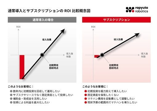 自在型自動倉庫「ラピュタASRS」は、お客様の倉庫環境や必要とされるスループット等の要件に合わせて柔軟に設計をカスタムする特性上、皆さま均一の月額料金で利用いただくサブスクリプションとは異なります。また、自動倉庫導入時の工事費とWMSなどお客様側での既存システム改修費は現時点ではサブスクリプションに含まれず、初期費用として発生いたします。通常導入時とサブスクリプションご利用時の比較イメージは以下です。
