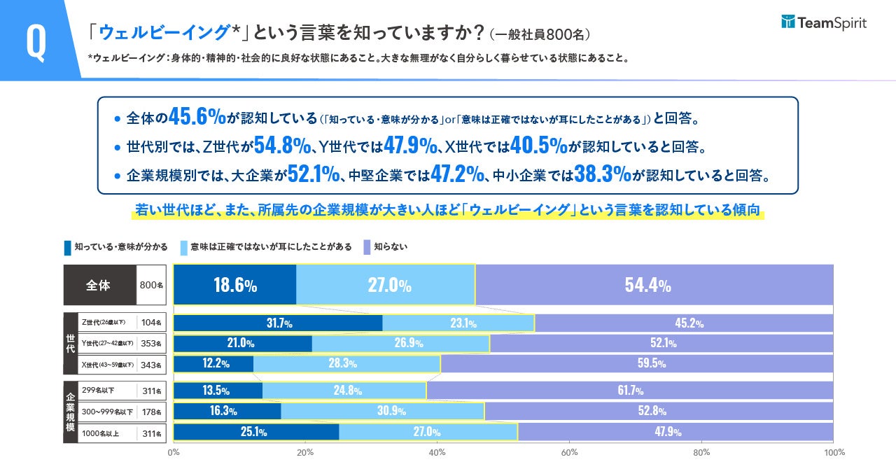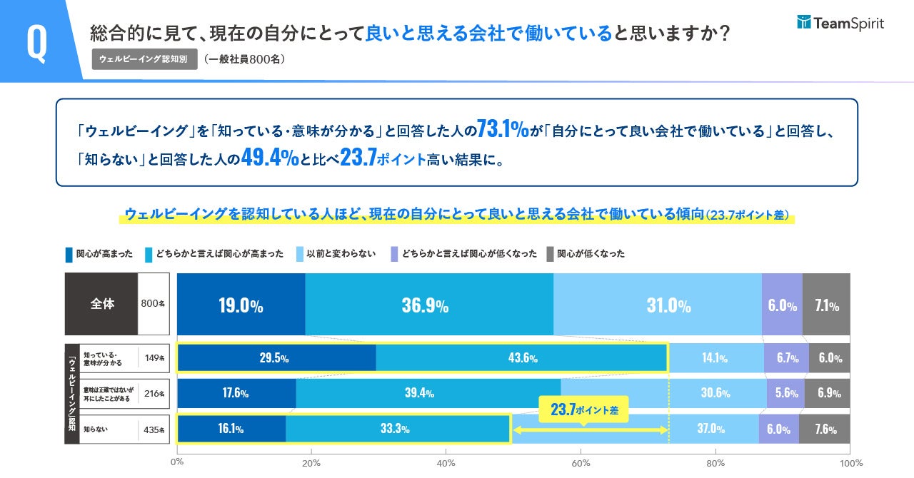今回の調査では、世代や企業規模によって「ウェルビーイング」への認知や関心に差があることが分かりました。全体的にウェルビーイングに対する認知度はまだ45.6%と高いとは言えませんが、ウェルビーイングを認知している人は会社や所属するチームに対してポジティブに捉えている傾向が見られました。
