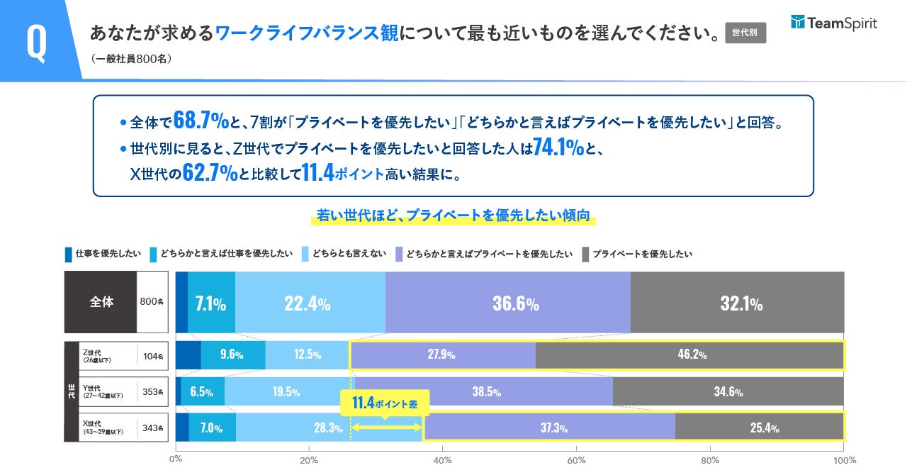 | 6 | 【ワークライフバランス観】 68.7%が「プライベートを最優先にしたい」「どちらかと言えばプライベートを優先したい」と回答。若い世代ほど、プライベートを優先したい傾向 |