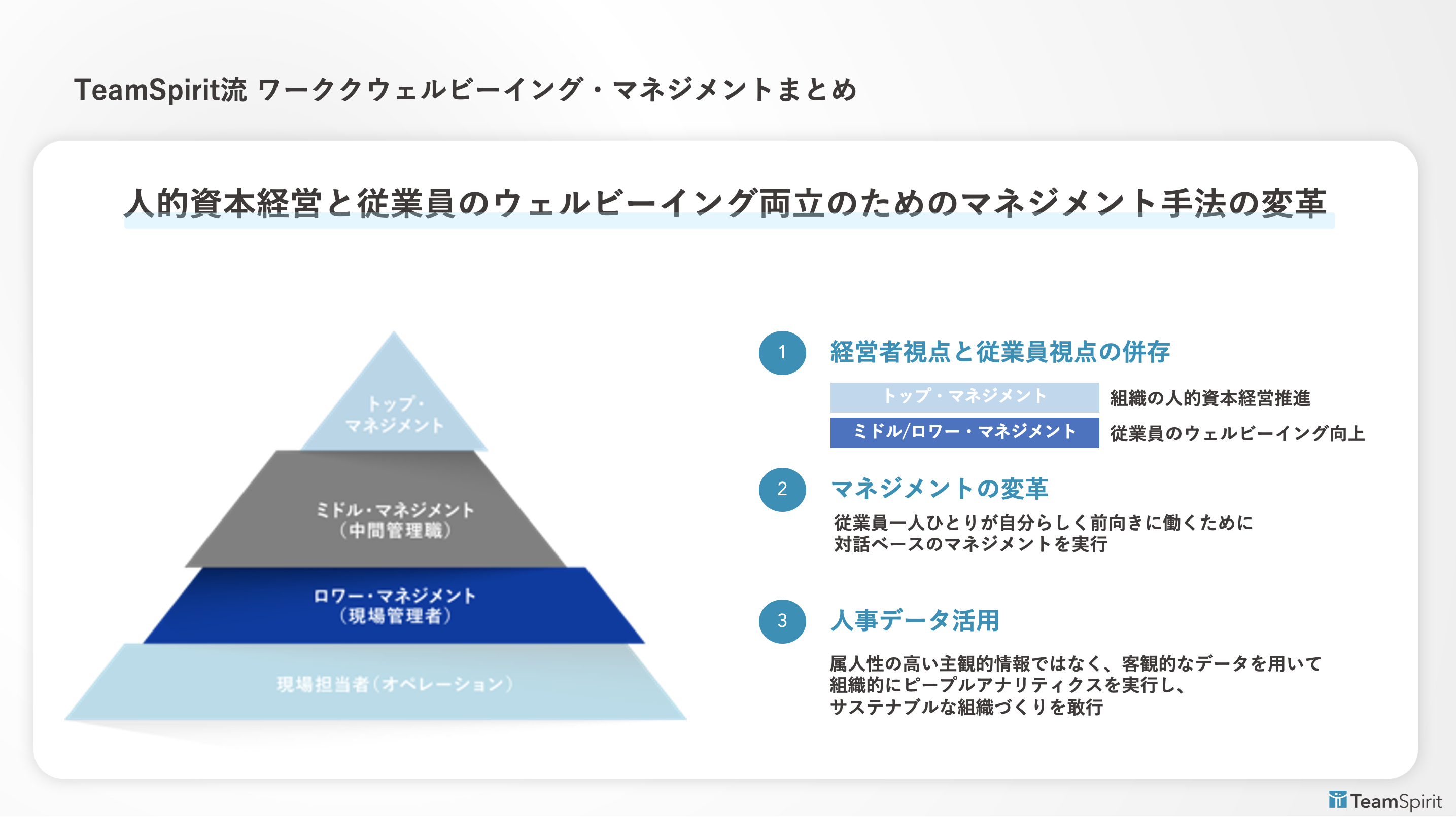 ※働く時間の中で、従業員のウェルビーイング(前向きに自分らしく生きること)を向上させるため各チーム単位でマネージャーが従業員一人ひとりの事情・意向や能力、働き方などの客観的データを基盤に個別最適なマネジメントを行うこと。