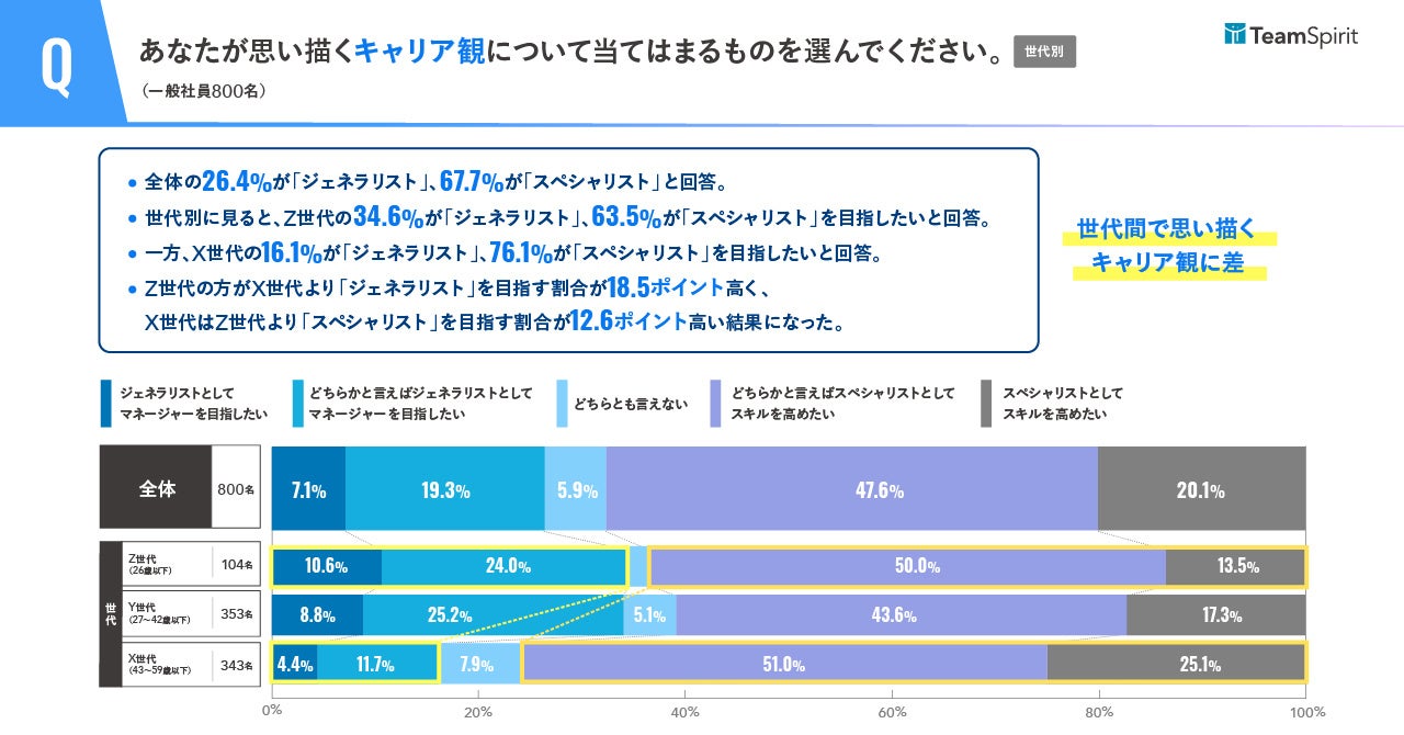 | 5 | 【思い描くキャリア観】 26.4%が「ジェネラリスト」と回答した一方、「スペシャリスト」と回答した人は67.7%と「スペシャリスト」を希望する人が多い傾向。世代別ではZ世代で「ジェネラリスト」と回答した人は34.6%と、X世代より18.5ポイント高く、若い世代ほどジェネラリストを志向する傾向 |