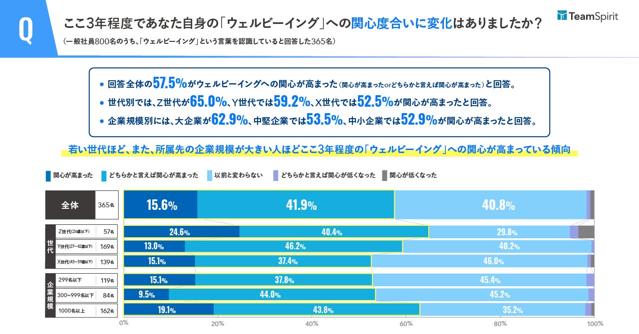 | 2 | 【ウェルビーイングへの関心】 「ウェルビーイング」を認知している人のうち、ここ3年程度で「ウェルビーイング」の関心が高まった人は57.5%という結果に。若い世代ほど、また、所属先の企業規模が大きいほど、ここ3年程度の「ウェルビーイング」への関心が高まっている傾向 |