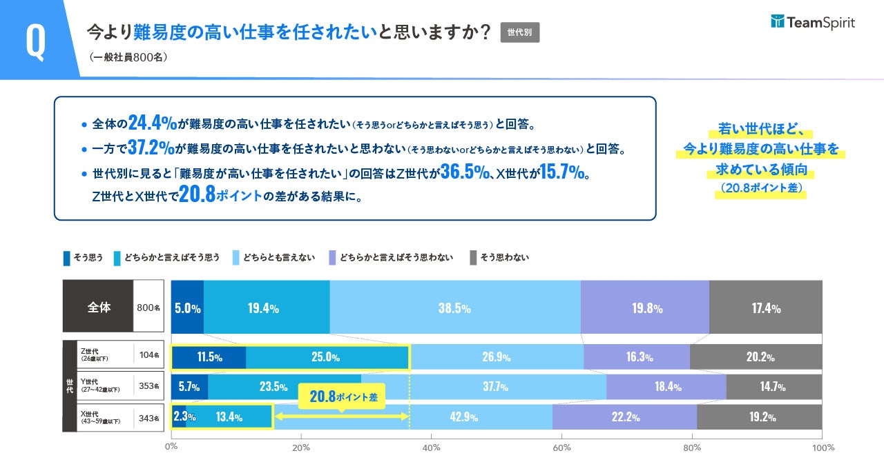 | 4 | 【今より難易度の高い仕事を任されたいか】 24.4%が「そう思う」「どちらかと言えばそう思う」と回答。若い世代ほど、今より難易度の高い仕事を求めている傾向 |