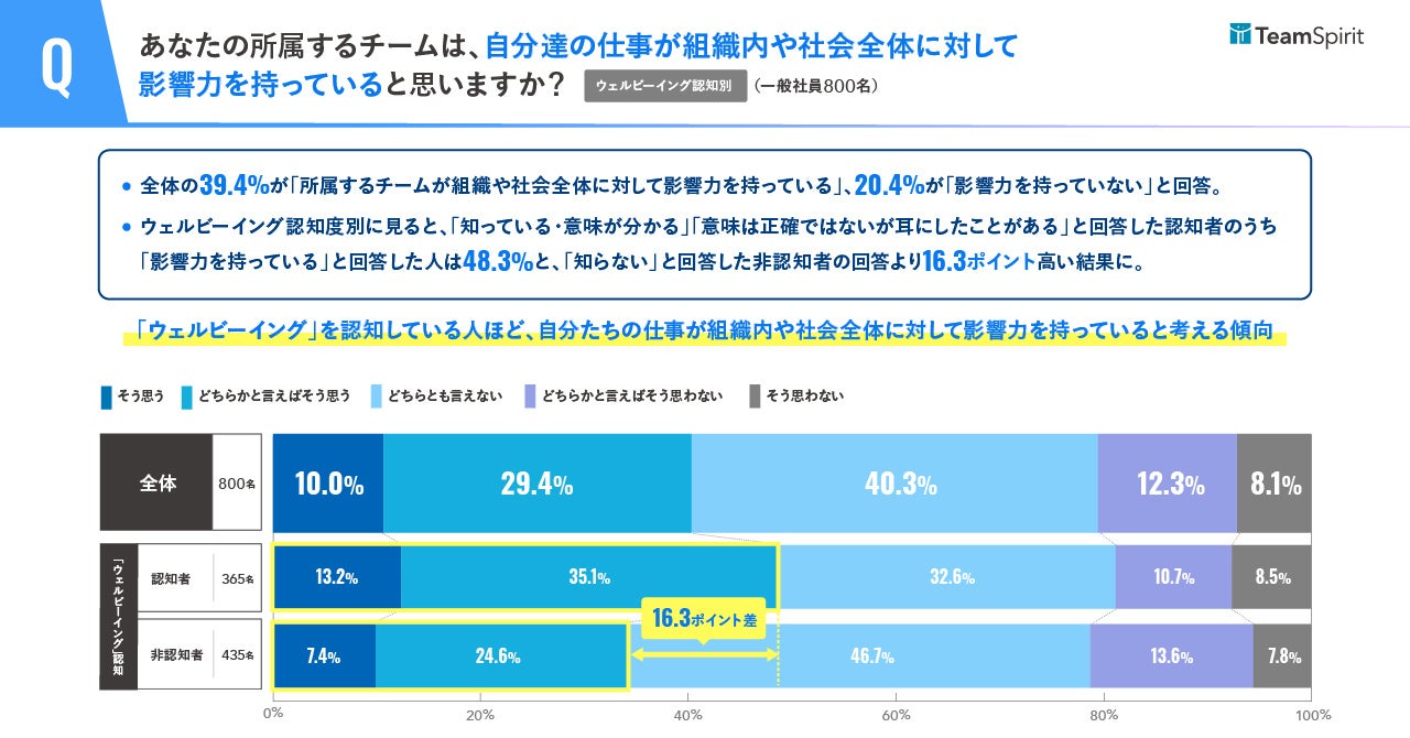 - ⑨【自分達の仕事が組織内や社会全体に対して影響力を持っているか】39.4%が「そう思う」「どちらかと言えばそう思う」と回答。「ウェルビーイング」を認知している人ほど、自分達の仕事が組織内や社会全体に対して影響力を持っていると考える傾向