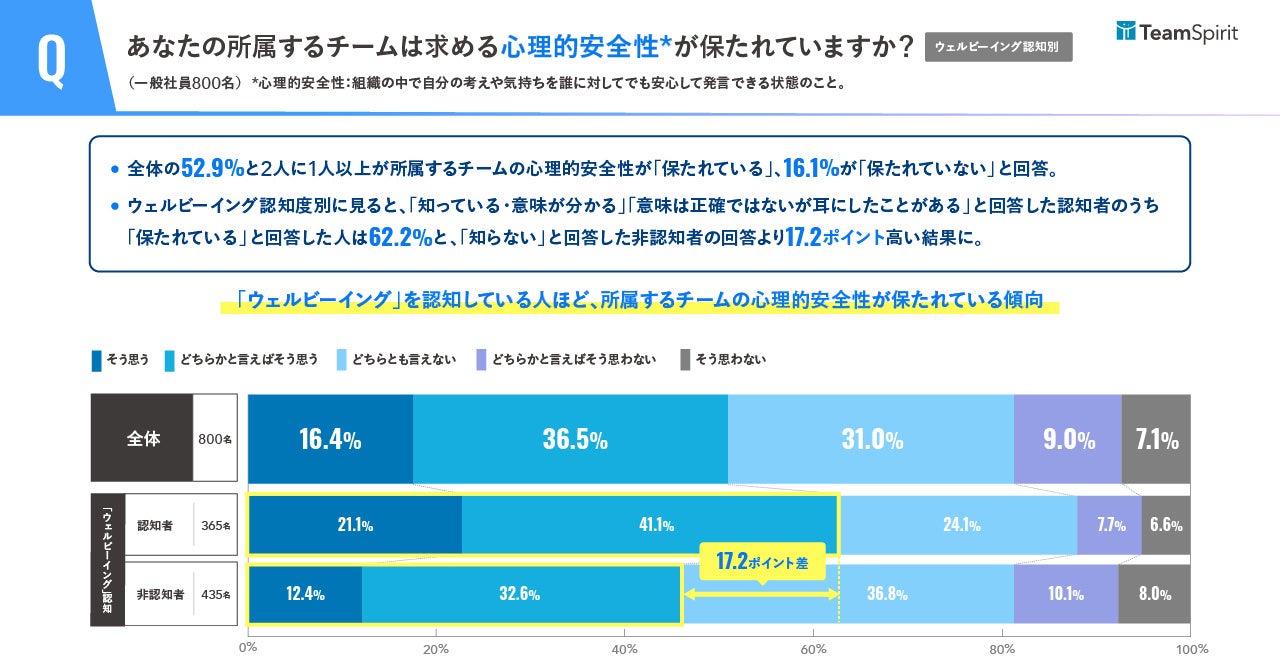 | 7 | 【チームの心理的安全性が保たれているか】 2人に1人以上(52.9%)が「そう思う」「どちらかと言えばそう思う」と回答。「ウェルビーイング」を認知している人ほど、所属するチームの心理的安全性が保たれている傾向 |
