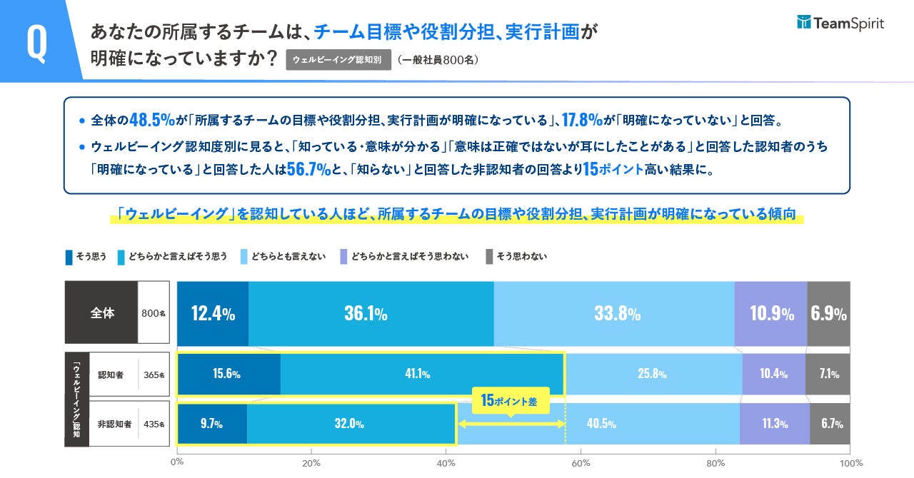 - ⑧【チーム目標や役割分担、実行計画が明確になっているか】48.5%が「そう思う」「どちらかと言えばそう思う」と回答。「ウェルビーイング」を認知している人ほど、所属するチームの目標や役割分担、実行計画が明確になっている傾向