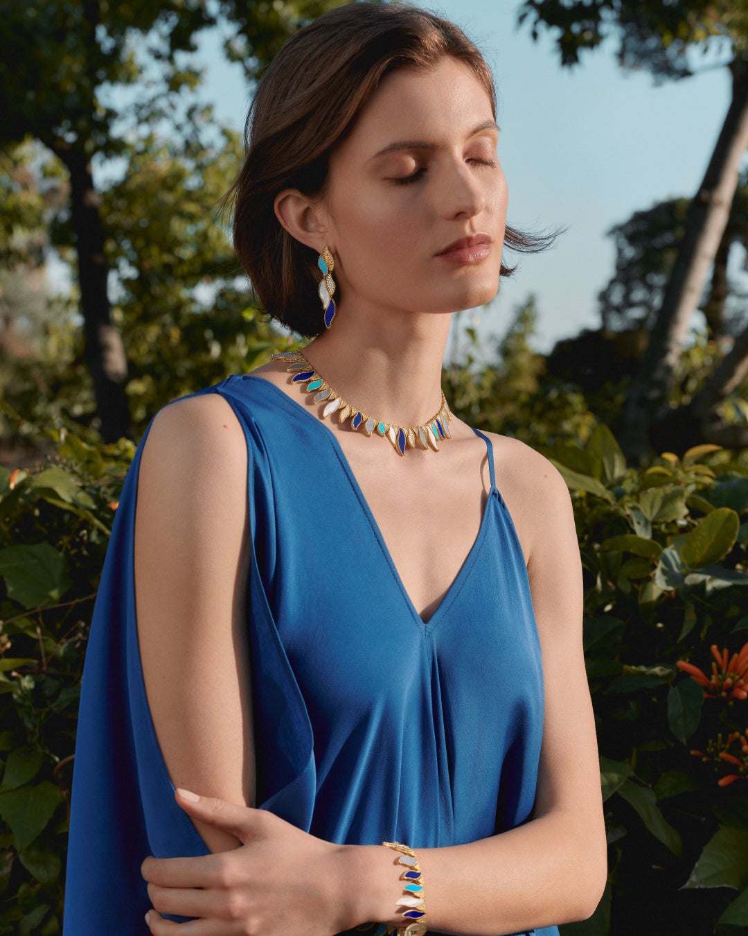 ネックレス、ブレスレット、イヤリングから成るジュエリーセットでは、波のうねりのようなラインが表現されています。水しぶきをイメージした大小のモチーフを交互に並べ、シンフォニーを成すようにアシンメトリーに仕上げることで、優雅な動きを演出し、身に着けたときに光り輝く効果をもたらします。首元と手首でうねる波に、クリース加工を施したイエローゴールドが輝きを添え、煌めくセットを形作っています。ビーズの縁取りで強調されたストーンは、打ち寄せる波のグラデーションを詩的に表現しています。ラピスラズリの紺碧の色合いが神秘的な深海を思わせる一方、カルセドニーとターコイズは穏やかな海岸を彷彿とさせます。さらに、マザーオブパールの虹色とダイヤモンドの輝きは、陽光に照らされた海の情景を心によみがえらせます。