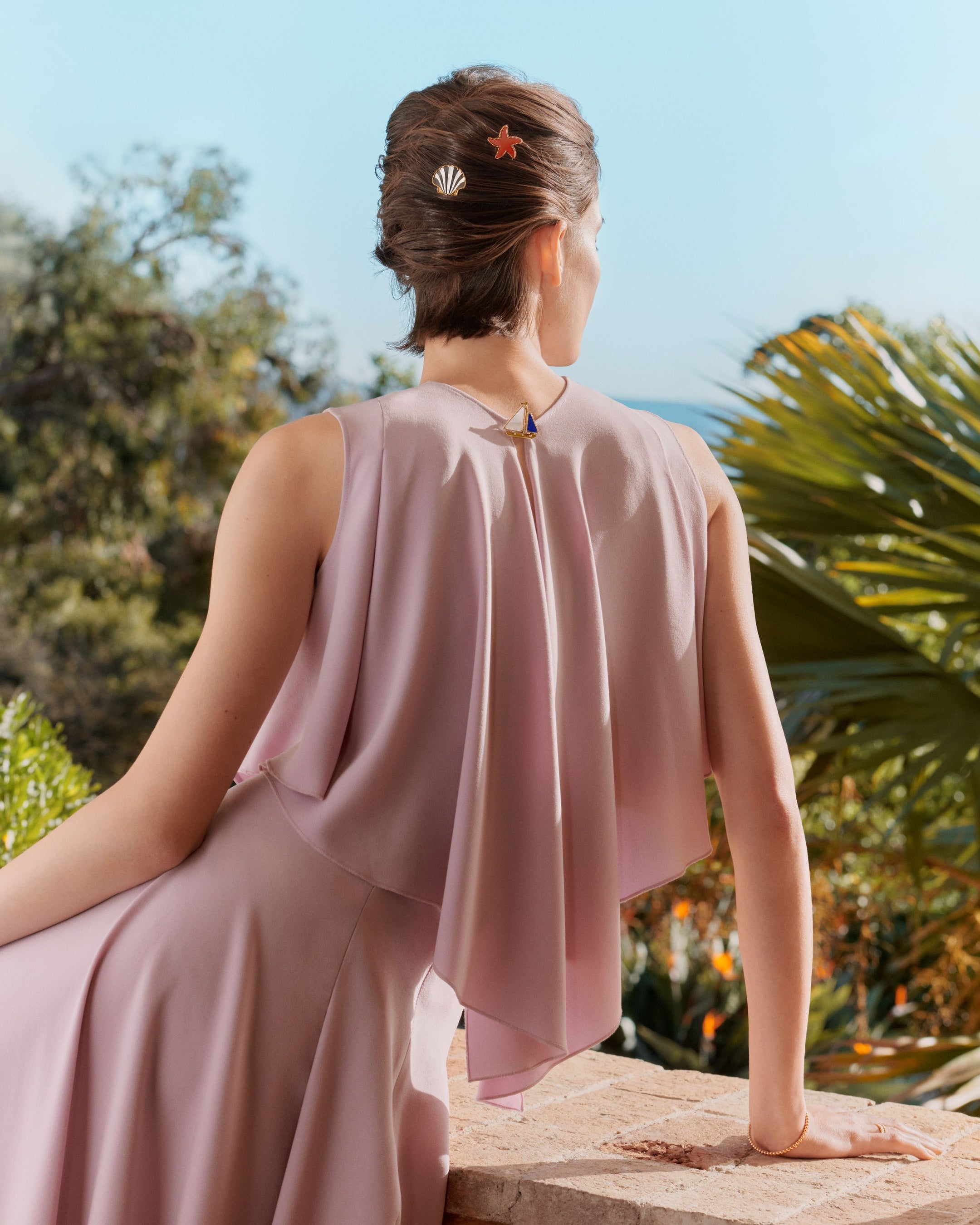 クリップでは、ボートや貝殻、ヒトデのモチーフが、夢のような夏を想起させる絵葉書のごとく、躍動感溢れる海の情景を生き生きと描き出します。スターフィッシュ クリップには、ローズゴールドがあしらわれ、モチーフの輝きをやわらかく引き立てています。一方、シーシェル クリップにはテクスチャード加工を、ボート クリップにはミラーポリッシュ仕上げを施すことで、イエローゴールドの煌めきが最大限に美しく高められています。ゴールドビーズの縁取りは、まるで太陽の光輪のように、それぞれの作品を飾っています。ゴールドビーズはメゾンを象徴するシグネチャーであり、そのソフトな光によって、それぞれのデザインの輝きを際立たせるのです。