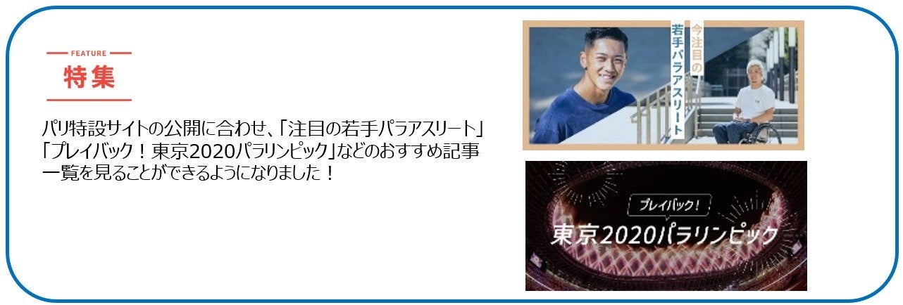 パリ特設サイトの公開に合わせ、「注目の若手パラアスリート」「プレイバック!東京2020パラリンピック」などのおすすめ記事一覧を見ることができるようになりました!