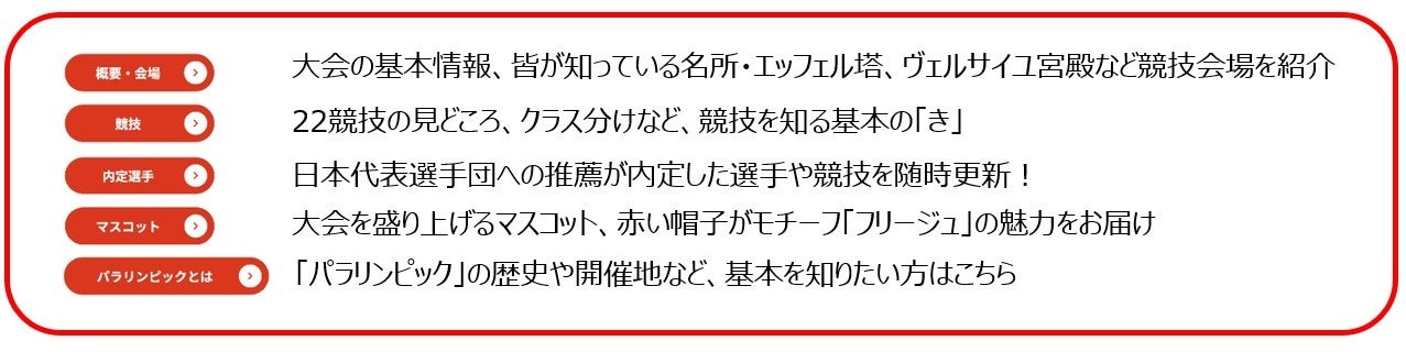 特設サイトでは、「概要・会場」「競技」「内定選手」「マスコット」「パラリンピックとは」 など、パリ大会を知って楽しむための情報から、パリ大会を目指すパラアスリートのコラム記事など、1年後に向けどんどん新しい情報を追加していく予定です。