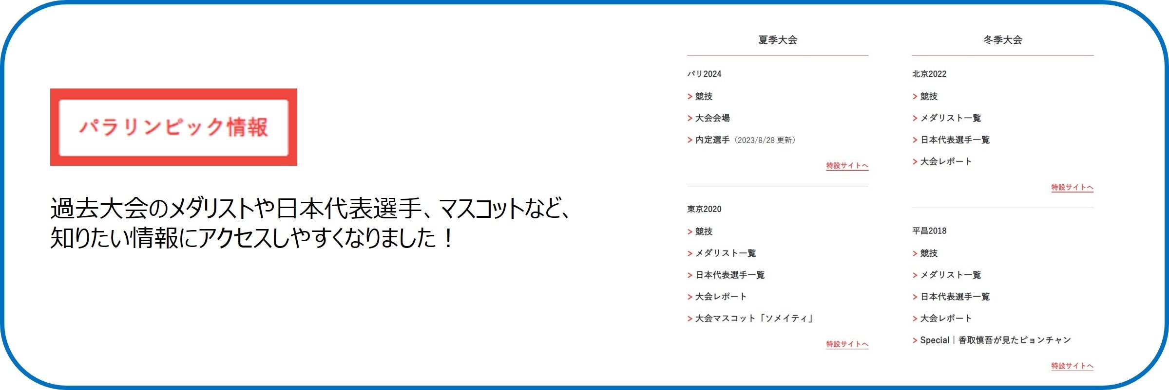 また「パラサポWEB」では、特設サイトの公開と同時に、「パラサポWEB」編集部が、お届けしたいホットな情報をピックアップする「特集ページ」、東京2020大会を含む過去大会の情報をまとめた「パラリンピック情報」メニューも追加しました。