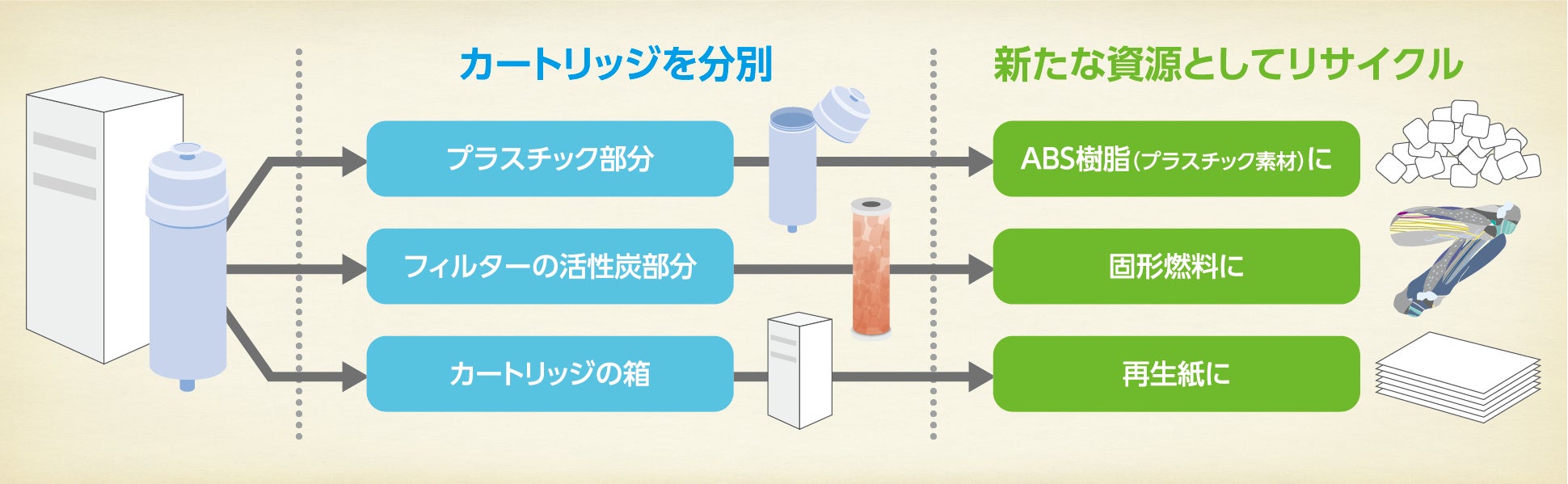 浄水カートリッジは、カートリッジとして再利用されるのではなく、新しい資源へと生まれ変わります。フィルター部分の活性炭は不織布などと加工されて固形燃料になります。外側のプラスチックケースはABS樹脂という汎用性の高いプラスチック素材に生まれ変わります。また、カートリッジの箱も再生紙になります。