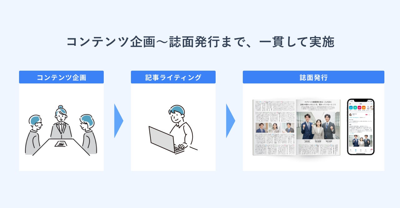 この度提供を開始するサービスでは、「コンテンツ企画」「インタビュー」「記事ライティング」「誌面レイアウト」「誌面発行」までを一貫してTUNAGの担当者が実施します。