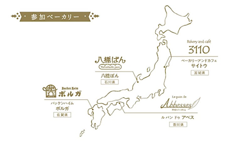 ・参加パン屋さん:Bakery and café 3110(宮城県)/Le pain de abbesses(香川県)/八橋ぱん(石川県)/バッケンハイム ボルガ(佐賀県)