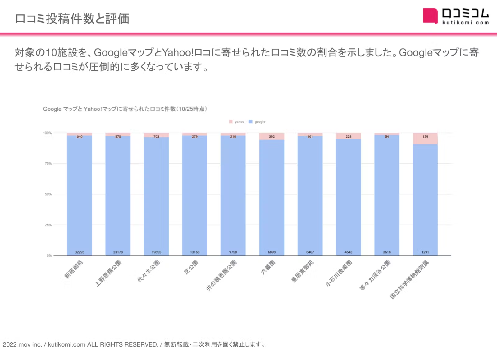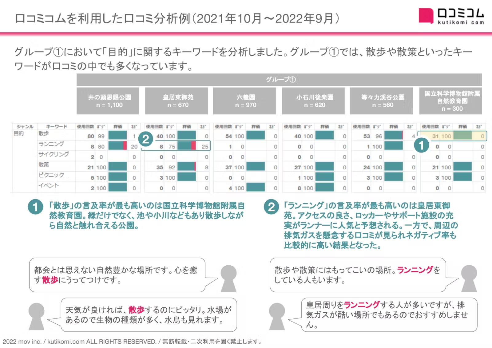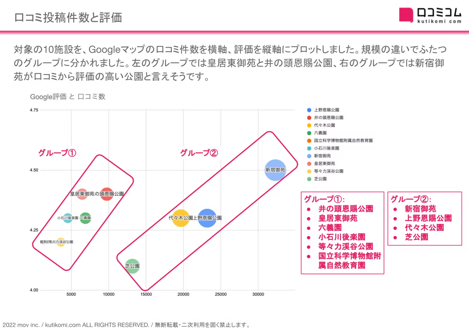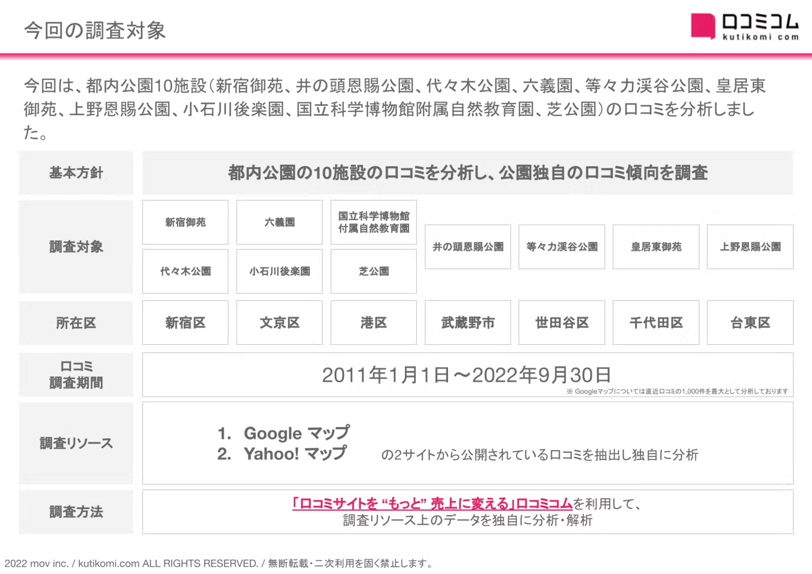 口コミサイトを”もっと”売上に変える店舗支援SaaS「口コミコム」を運営する株式会社mov(代表取締役:渡邊 誠、本社:東京都渋谷区、以下mov)では、『口コミコム』の分析機能を用いてレポートを作成しています。今回は新宿御苑や代々木公園、井の頭恩賜公園など、都内公園10施設の口コミを分析しました。