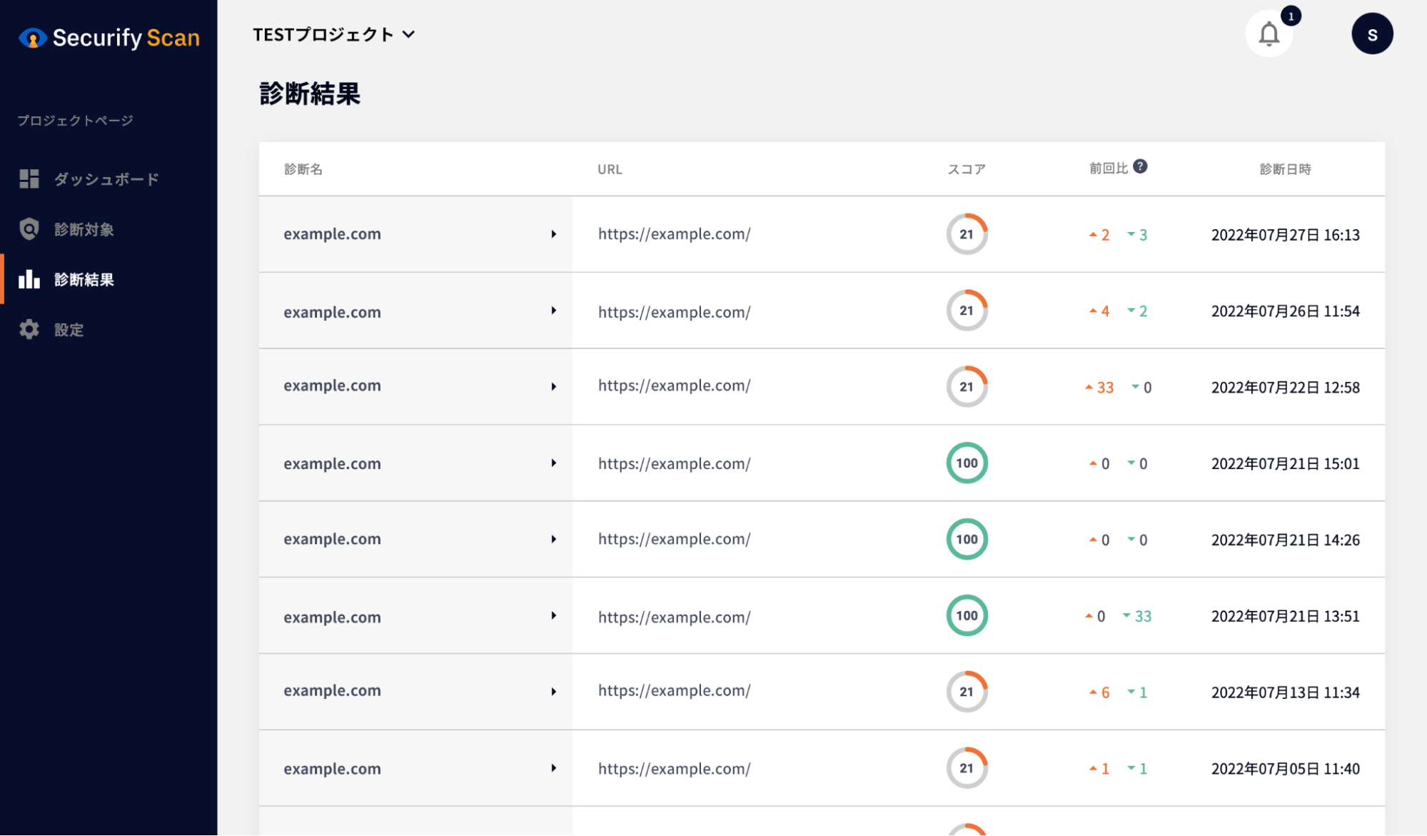 ・最新の診断結果や、診断の状況、発見された脆弱性の推移など、現在のステータスを直感的に把握できます。