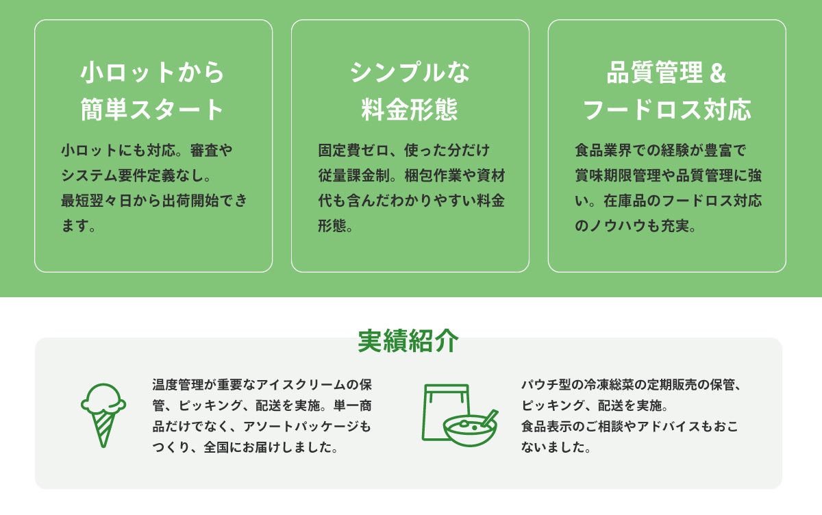 マッスルデリの物流サービスはこれらの課題を解決するため、シンプルな料金形態、簡単で柔軟な対応が可能で、中でも冷凍、冷蔵の低温物流に強みがあります。3PLの付加サービスとして、自社のノウハウを活用した品質管理、フードロス対応も可能で、賞味期限やフードロスも考慮したコスト戦略をご提案できます。