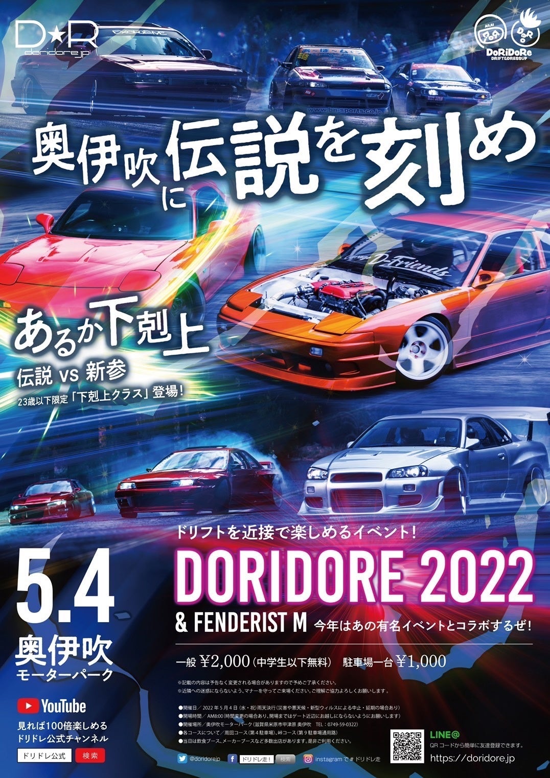 5月4日(祝)奥伊吹モーターパーク&イベント会場(https://www.okuibuki.co.jp/green/)の「峠コース」や駐車場を利用した「ドリフト&ドレスアップカー」の融合イベント「ドリドレ走2022」を開催します。